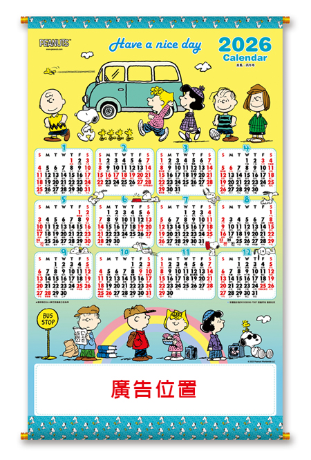 特色:讓最可愛的旅行夥伴史努比與查理布朗和他的朋友們一同展開一場充滿冒險的旅行吧!無論是家中、辦公室還是學校,都能為您的生活增添更多童趣和溫暖。讓幽默風趣的史努比暖心陪伴您一整年。背面為空白
