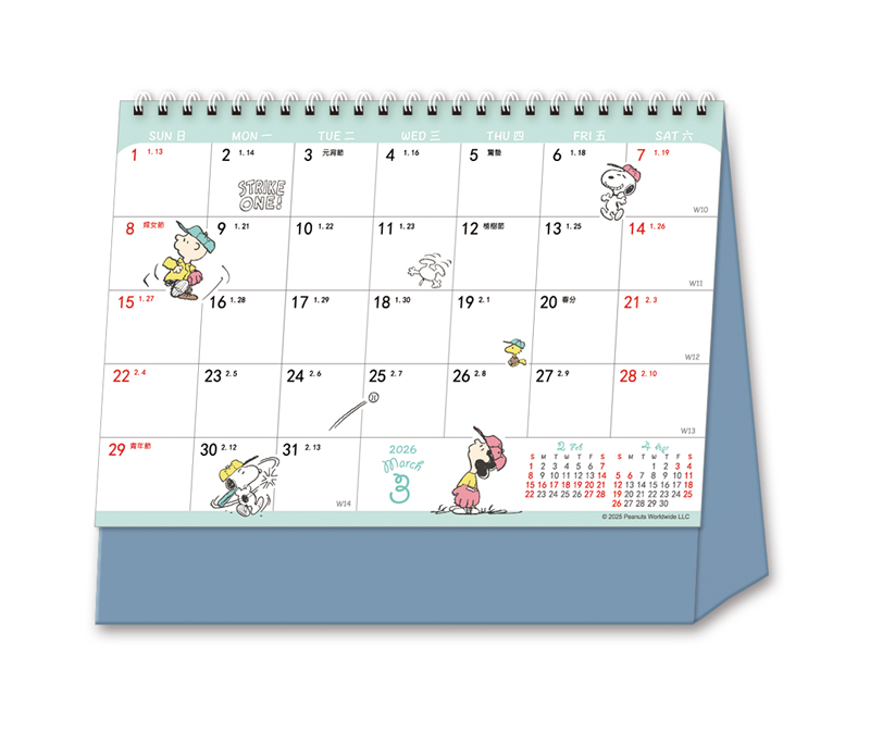 特色:一隻小獵犬卻不承認自己是隻狗。思維天馬行空、超級自信、也是狗中的偽裝天才。讓幽默風趣的史努比暖心療癒您一整年。